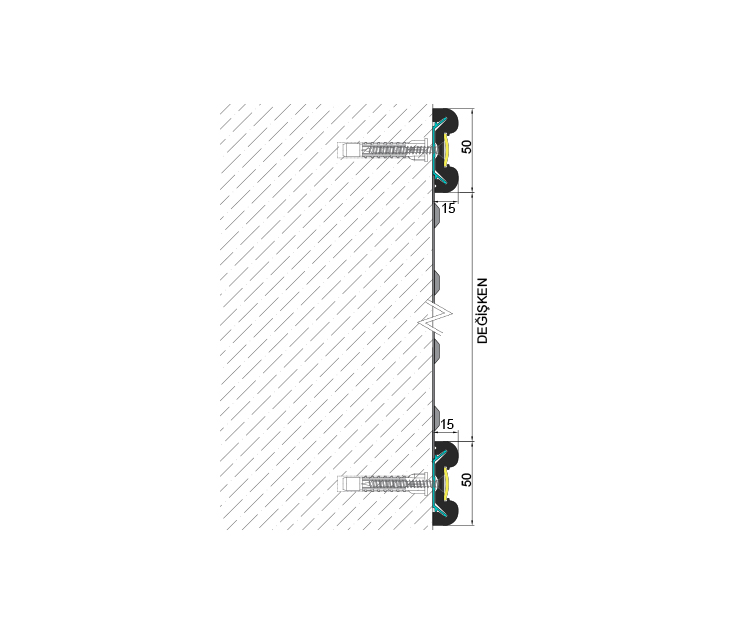 50 mm genişlikte, 15 mm kalınlıkta alüminyum gövdeli kauçuk duvar koruma sistemidir.