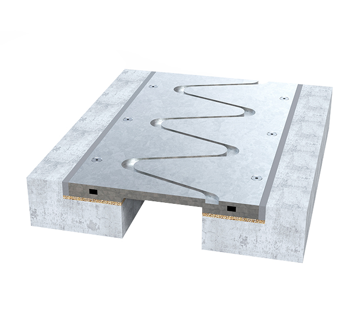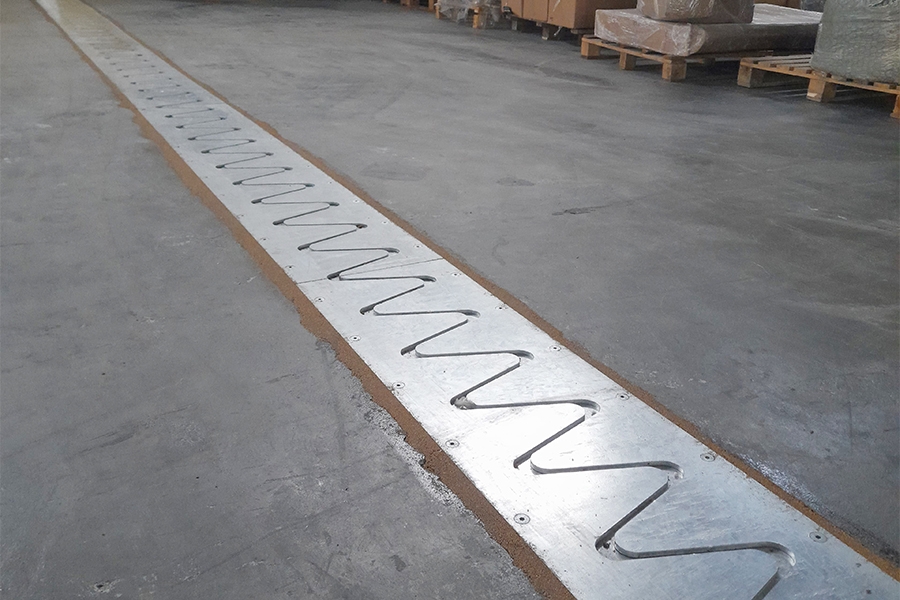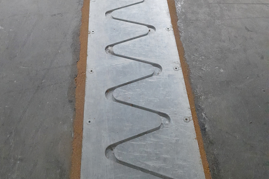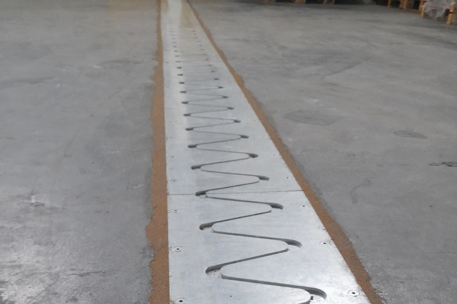 Flush Mounted Expansion Joint profile with steel reinforcement at below, galvanized steel top surface and resistant to intense forklift load. Suitable for Industrial Structures