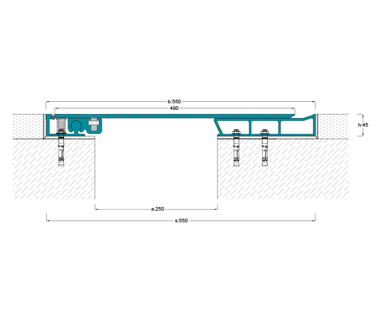 Tek taraftan mafsallı yüksek hareket kapasitesine sahip galvaniz çelik üst yüzeyli zemin dilatasyon profili.