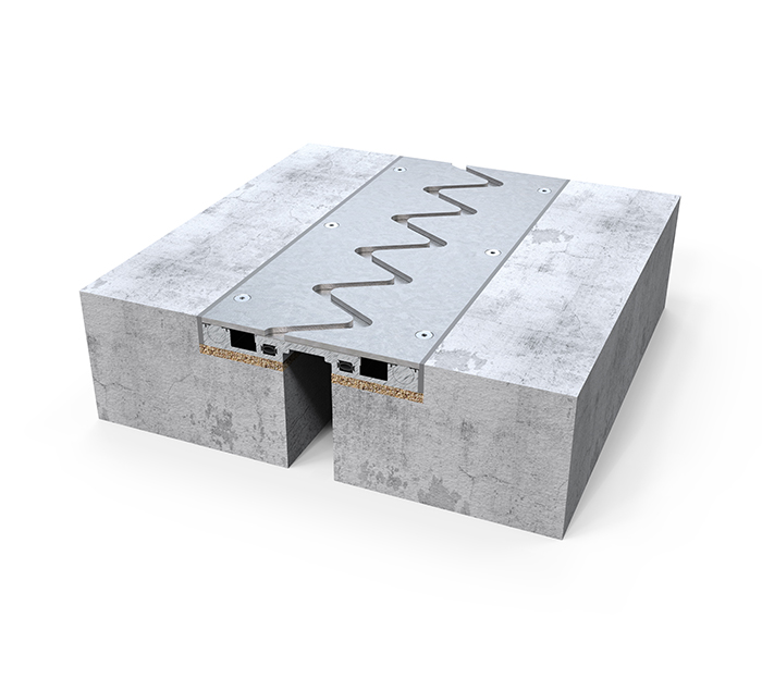 Yoğun forklift trafiğine dayanıklı olduğu için genellikle endüstriyel yapılarda tercih edilen alüminyum alt taşıyıcılı, galvaniz çelik üst yüzeyli kaplama altı zemin dilatasyon profili.