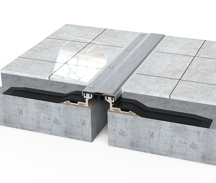Нержавеющий Деформационный шов, подходящий для террас, парковок, который удовлетворяет требованиям по водонепроницаемости благодаря применению гидроизоляции и битумных мембран, обеспечивающих полную непроницаемость в зонах повышенной влажности. Когда теплоизоляционный слой устраивается поверх гидроизоляции, высота порога напольного покрытия возрастает с увеличением слоя бетона в основании. Следует применять слой геотекстильного материала по верху битумной мембраны для предохранения мембраны и нижних слоев.